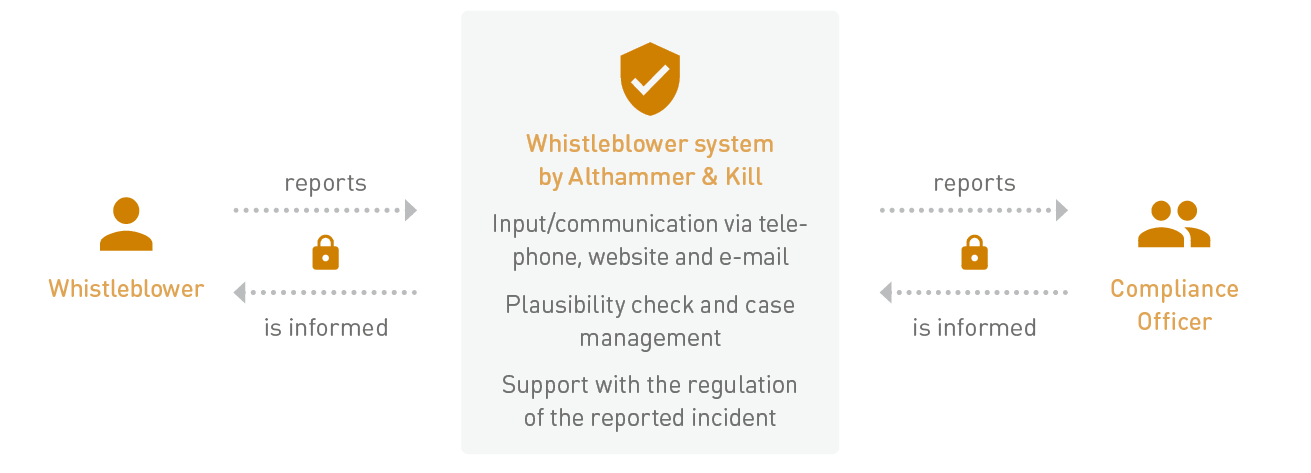 Die Althammer & Kill GmbH & Co. KG stellt die interne Meldestelle bereit. Sie ist ein bundesweit tätiges Beratungs-Unternehmen für Compliance. Die Mitarbeitenden sorgen dafür, dass der Schutz des Hinweis-Gebers sichergestellt ist.